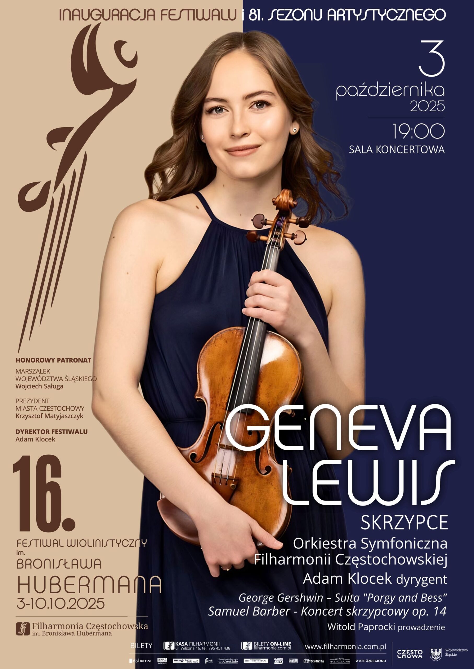 Na inauguracji w piątek, 3 października, o godz. 19 w Filharmonii Częstochowskiej wystąpi Geneva Lewis, amerykańska skrzypaczka pochodząca z Nowej Zelandii, urodzona w 1998 roku. Zaczęła grać na skrzypcach w wieku 3 lat. Studiowała w Colburn School w Los Angeles pod kierunkiem legendarnego pedagoga Itzhaka Perlmana i uznanej skrzypaczki Miriam Fried. Jest laureatką wielu prestiżowych konkursów, m.in. zdobyła pierwszą nagrodę na Concert Artists Guild Competition (2020) oraz Avery Fisher Career Grant (2021). Występowała z takimi orkiestrami jak Orpheus Chamber Orchestra, Pasadena Symphony czy Auckland Philharmonia. Często koncertuje również jako kameralistka. Ceniona za głęboką muzykalność, techniczną precyzję i dojrzałość interpretacyjną, Geneva Lewis uważana jest za jedną z najbardziej obiecujących skrzypaczek młodego pokolenia.