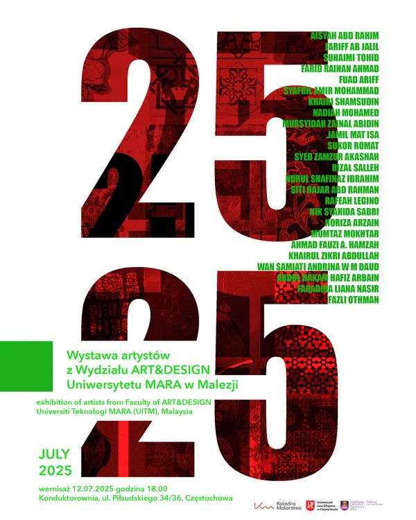 Tego samego dnia, w sali górnej odbędzie się również otwarcie wystawy „25/25”. To prezentacja prac 25 artystów z Wydziału Sztuki i Designu Uniwersytetu MARA w Malezji. Wydarzenie powstało we współpracy z Katedrą Malarstwa Wydziału Sztuki Uniwersytetu Jana Długosza w Częstochowie. Jej kuratorkami są Justyna Warwas i Jadwiga Jankowska.