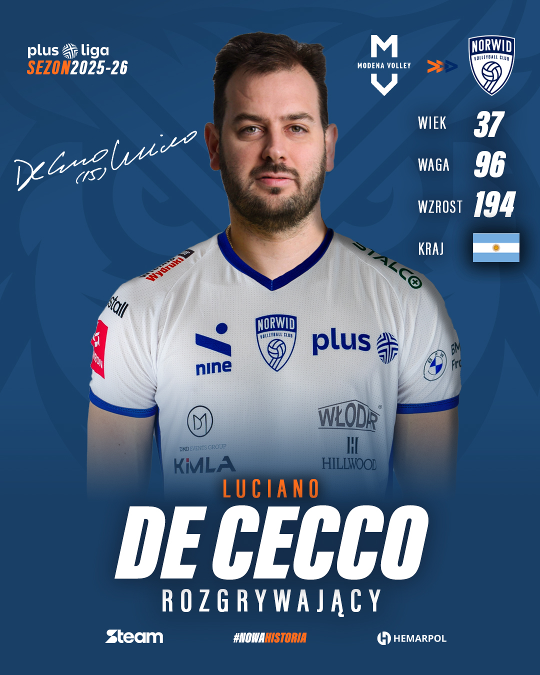 De Cecco to zawodnik z ogromnym doświadczeniem na najwyższym poziomie, reprezentant Argentyny (brązowy medalista IO w Tokio) oraz kluczowa postać czołowych klubów włoskiej Serie A (2x mistrzostwo Włoch). Dla Norwida to ogromne wzmocnienie i jasny sygnał, że klub chce walczyć o jak najwyższe cele w sezonie 2025/2026.