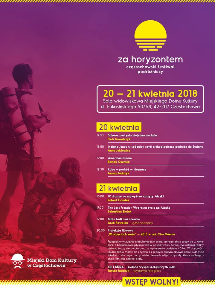 Na początku Piotr Kowalczyk przedstawi swoje wspomnienia Saharze, następnie Anna Jakiewicz opowie o archeologicznych podróżach do Sudanu, potem Bartek Osumek o amerykańskim śnie. Na koniec pierwszego dnia festiwalu relację z pobytu na Kubie przedstawi Janusz Jadczyk.