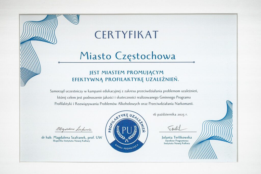 Sam symboliczny dokument „Gmina Promująca Profilaktykę Uzależnień” odebrał od dr hab. Magdaleny Szafranek prezydent Krzysztof Matyjaszczyk. Podkreślił od razu, że to tak naprawdę wyraz uznania dla pracy różnych środowisk zgromadzonych na sali. A uczestnikami spotkania byli pracownicy socjalni, pedagodzy, wychowawcy, terapeuci, kuratorzy, osoby pracujące bezpośrednio z ludźmi uzależnionymi, przedstawiciele sądów, funkcjonariusze policji. Prezydent Częstochowy podziękował też swojemu zastępcy Ryszardowi Stefaniakowi, stojącemu na czele Miejskiej Komisji Rozwiązywania Problemów Alkoholowych i w ogóle zajmującemu się całokształtem polityki społecznej w mieście.