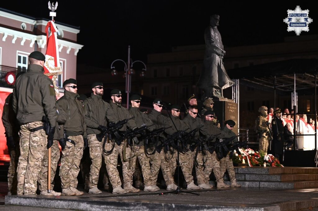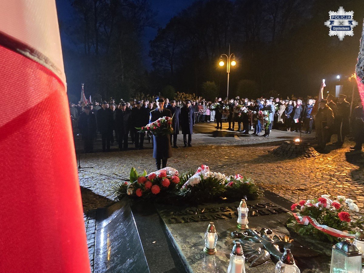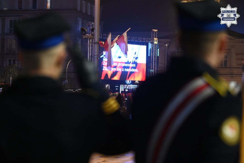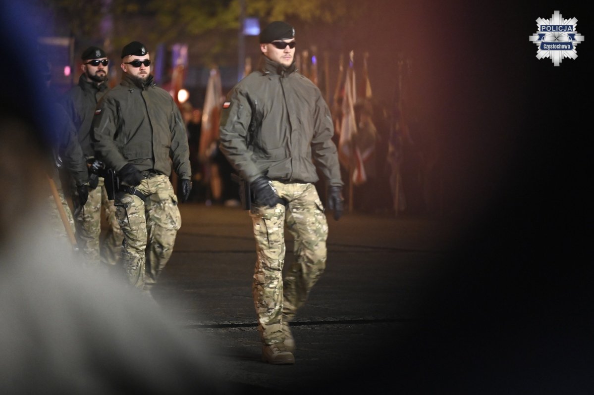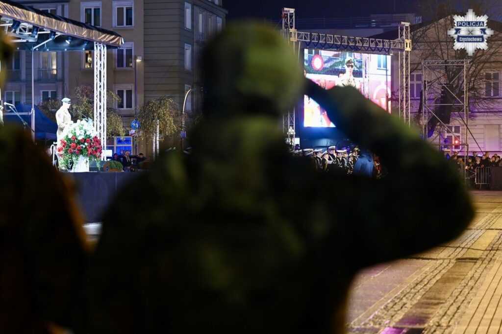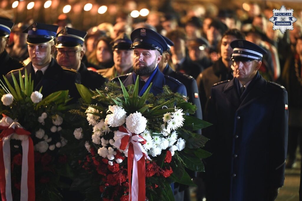 O godzinie 10 delegacja częstochowskiej komendy z młodszym inspektorem Sławomirem Zagrobelnym na czele uczestniczyła we mszy świętej za ojczyznę w Bazylice Archikatedralnej Świętej Rodziny. Po mszy uczestnicy przemaszerowali na plac Daszyńskiego, gdzie złożyli wiązanki pod pomnikiem Papieża Jana Pawła II. Podczas dalszego przemarszu złożony został hołd pod tablicą upamiętniającą generała Stanisława Sojczyńskiego „Warszyca”, a następnie pod pomnikiem marszałka Józefa Piłsudskiego. Na zakończenie delegacje uczciły pamięć poległych składając kwiaty przy Grobie Nieznanego Żołnierza oraz przy pomniku księdza Jerzego Popiełuszki w alei Sienkiewicza.