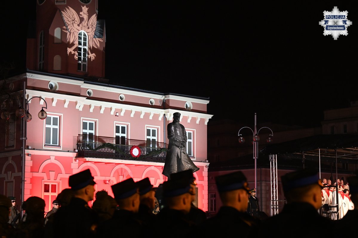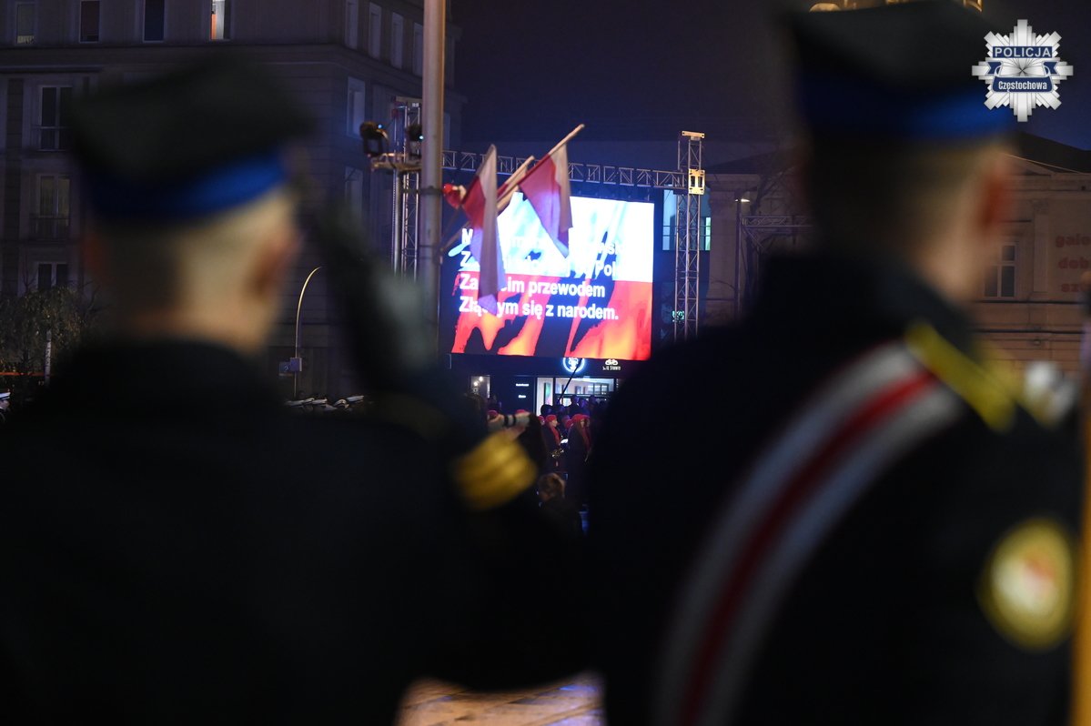 Po godzinie 16 rozpoczęły się miejskie obchody Święta Niepodległości. komendant miejski policji w Częstochowie młodszy inspektor Sławomir Zagrobelny wraz ze swoim zastępcą nadkomisarzem Rafałem Drewniakiem oraz przedstawicielami służb mundurowych złożyli kwiaty przy Grobie Nieznanego Żołnierza oraz przy pomniku księdza Jerzego Popiełuszki, a następnie przemaszerowali na plac Biegańskiego, gdzie pod pomnikiem marszałka Józefa Piłsudskiego odbyły się główne uroczystości.
