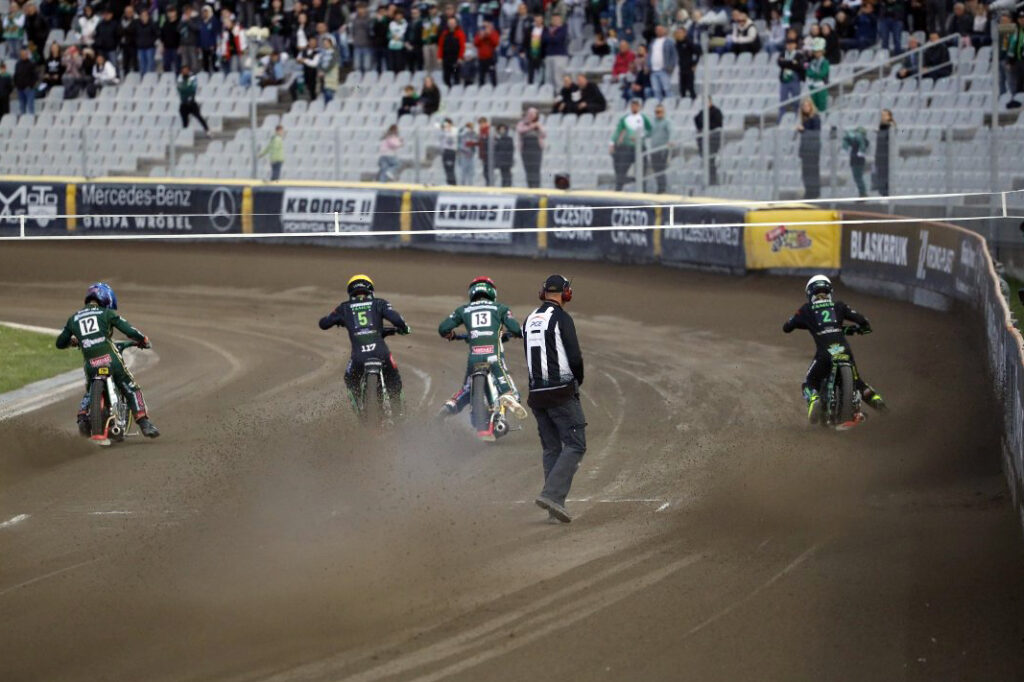 Po przerwie na równanie toru znów błysnął Knudsen, który przywiózł za plecami Doyle’a, Maksyma Drabika i Szymona Ludwiczaka. Dzięki temu goście utrzymywali kontakt.