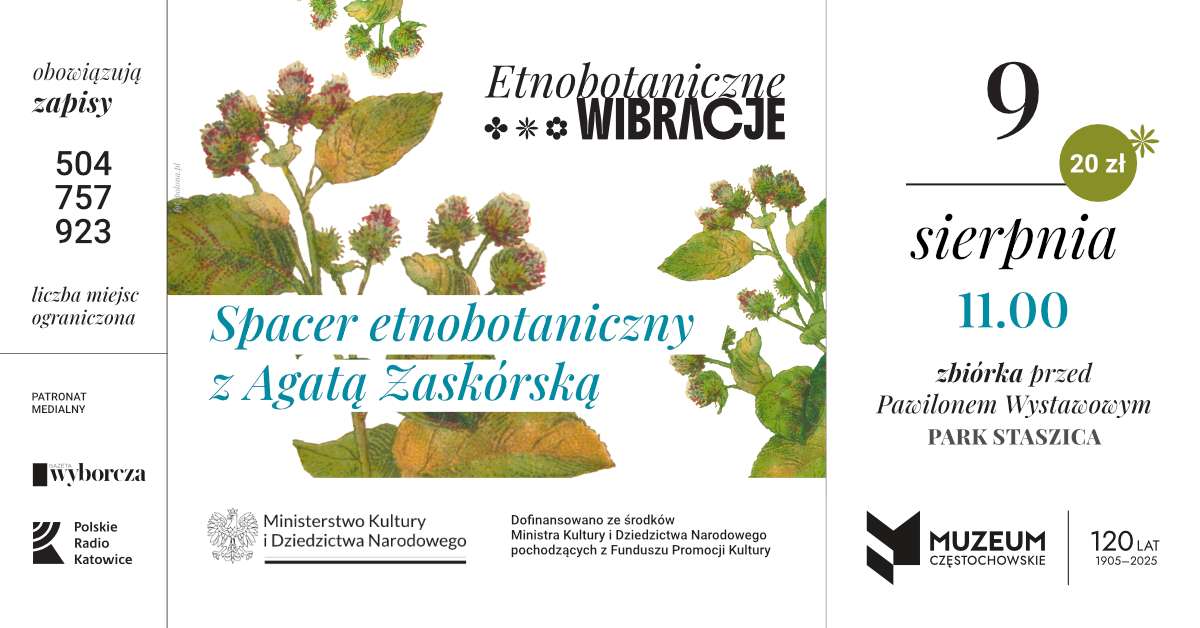 Pierwsze wydarzenie to spacer edukacyjny po Parku 3 Maja, który odbędzie się 9 sierpnia o godzinie 11. Poprowadzi go zielarka i edukatorka naturalna – Agata Zaskórska z Pracowni Nimrodel w Częstochowie. Uczestnicy będą mieli okazję poznać właściwości roślin, ich znaczenie w tradycji i zastosowanie w życiu codziennym. Zbiórka chętnych do udziału w wydarzeniu zaplanowana jest przed Pawilonem Wystawowym w Parku Staszica. Koszt udziału to 20 złotych.