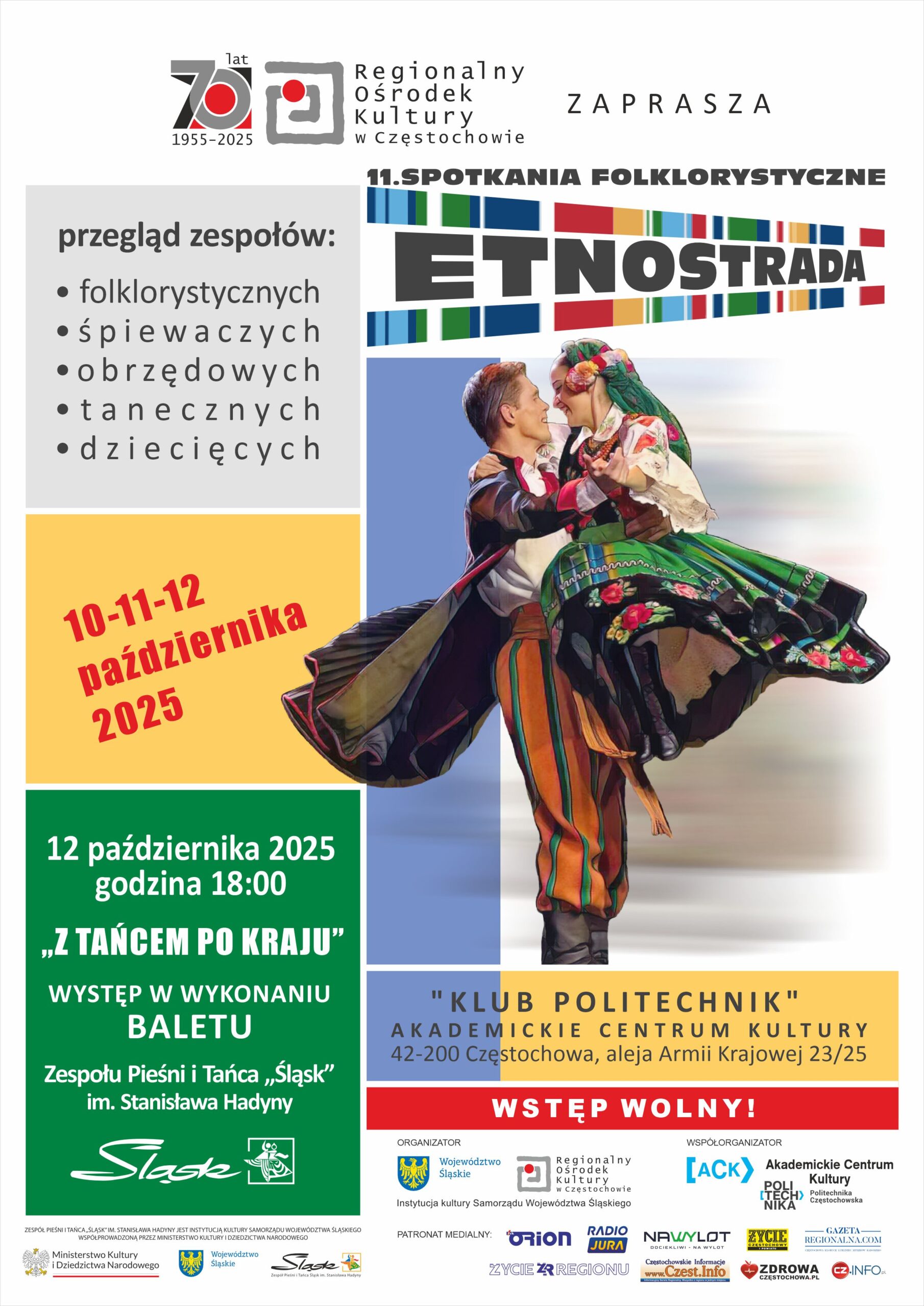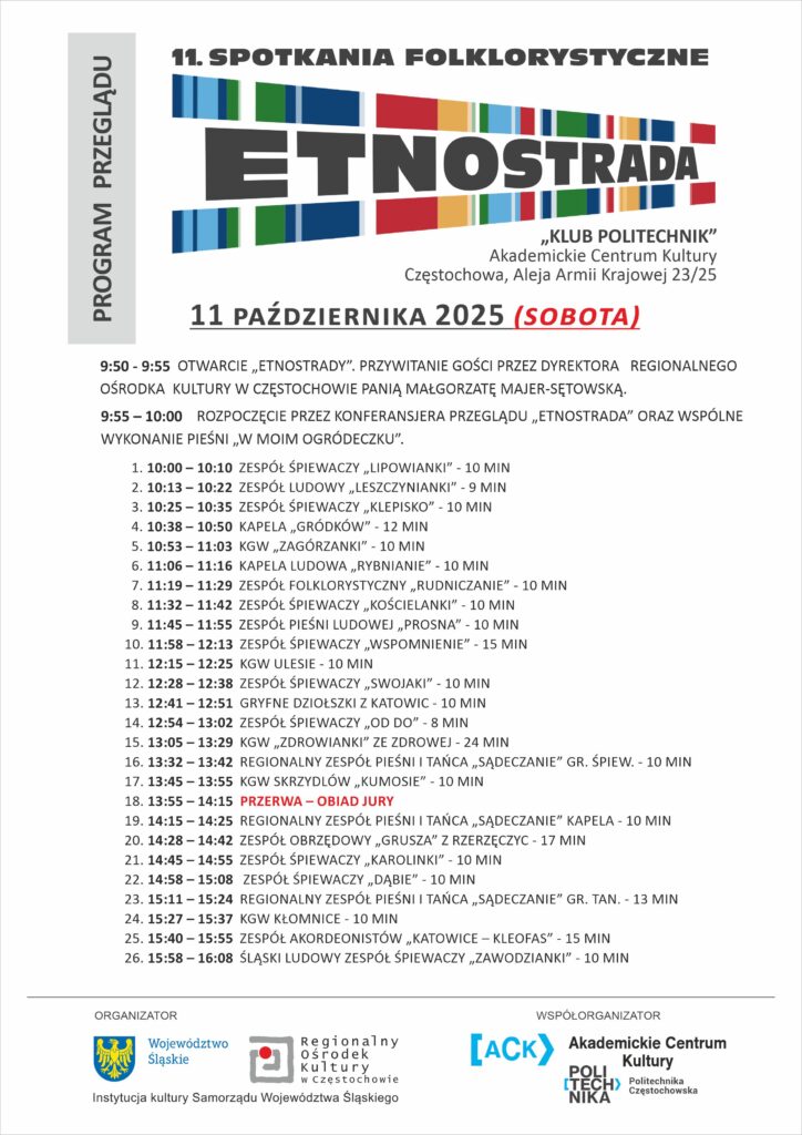 Regionalny Ośrodek Kultury w Częstochowie zaprasza na 11. Spotkania Folklorystyczne Etnostrada, które odbędą się w dniach 10–12 października w Klubie Politechnik.