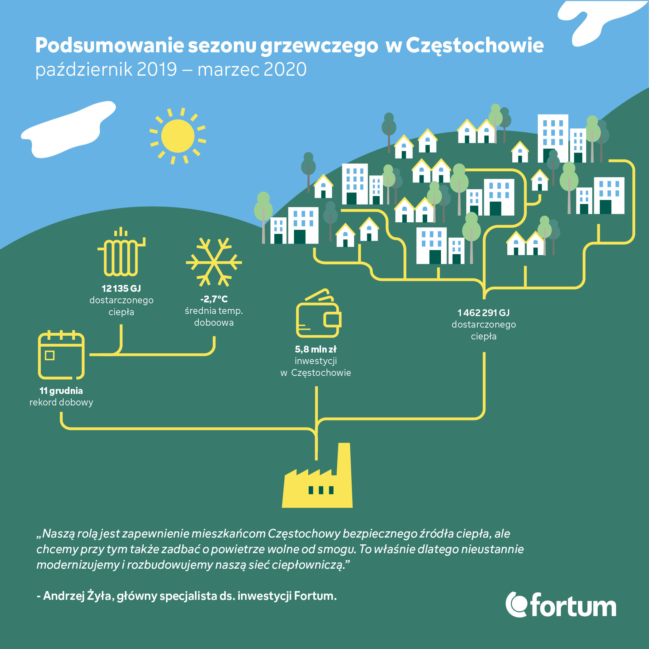 Od października 2019 r. do marca 2020 r. Fortum dostarczyło w Częstochowie łącznie ponad 1 462 291 GJ ciepła, czyli o 2,5 proc. więcej niż w poprzednim okresie grzewczym. To jednak wciąż mniej (o 2,4 proc.) wykorzystanego ciepła niż średnio podczas wcześniejszych czterech sezonów. Najwięcej ciepła częstochowianie potrzebowali 11 grudnia 2019 r., który okazał się najzimniejszym dniem w minionym sezonie grzewczym – średnia dobowa temperatura wyniosła -2,7 stopni Celsjusza. Tego dnia Fortum dostarczyło mieszkańcom Częstochowy 12 tys. 135 GJ.