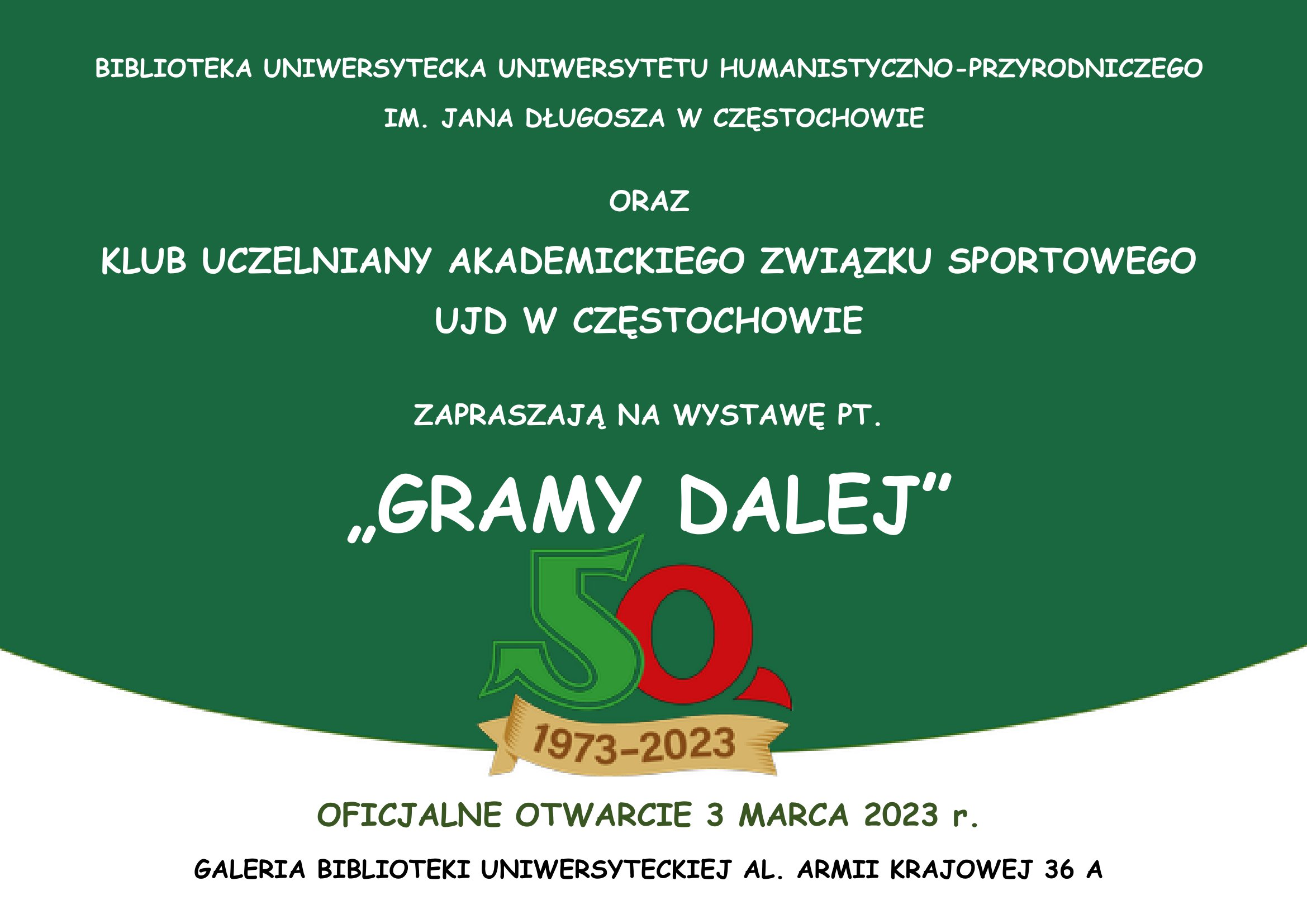 17 marca 1973 roku przy Wyższej Szkole Nauczycielskiej powołano Akademicki Związek Sportowy. 50 lat to pasmo sukcesów organizacyjnych i sportowych, były też i porażki jak to w sporcie bywa. Studenci i pracownicy WSP, AJD i UJD zdobyli 440 medali w mistrzostwach Polski Uczelni. Studenci-sportowcy brali udział w Igrzyskach Olimpijskich, Igrzyskach Głuchych, Mistrzostwach Świata, Europy i Polski oraz Uniwersjadach, Akademickich Mistrzostwach Świata, Europy. Perełką sportową Uczelni jest tenis stołowy, potwierdzony 11 zdobytymi medalami drużynowych mistrzostw Polski kobiet, 8 wywalczonymi pucharami Polski i 39 medalami indywidualnych mistrzostwami Polski oraz 46 pojedynkami w pucharach europejskich. W 1998 roku wygraliśmy współzawodnictwo sportowe Polskiego Związku Tenisa Stołowego (326 polskich klubów). Sukcesy zostały udokumentowane wycinkami sportowymi z lat 1975-2023. Jako KU AZS zorganizowaliśmy 28 mistrzostw Polski Szkół Wyższych w 7 dyscyplinach sportowych. Były też Festiwale tenisa stołowego, Akademickie Dni Sportu i Kultury, Indywidualne Mistrzostwa Polski seniorów tenisie stołowym oraz prestiżowe XII Mistrzostwa Europy Niesłyszących i Centralna Inauguracja Akademickiego Roku Sportowego (2000 r.). Okazją do wspomnień będzie spotkanie pokoleń w dniu 18 marca b.r. Uroczystości będą trwały przez cały 2023 r. Początek nastąpi 3 marca w Bibliotece, kiedy to zostanie otwarta wystawa historyczna „Gramy dalej”.