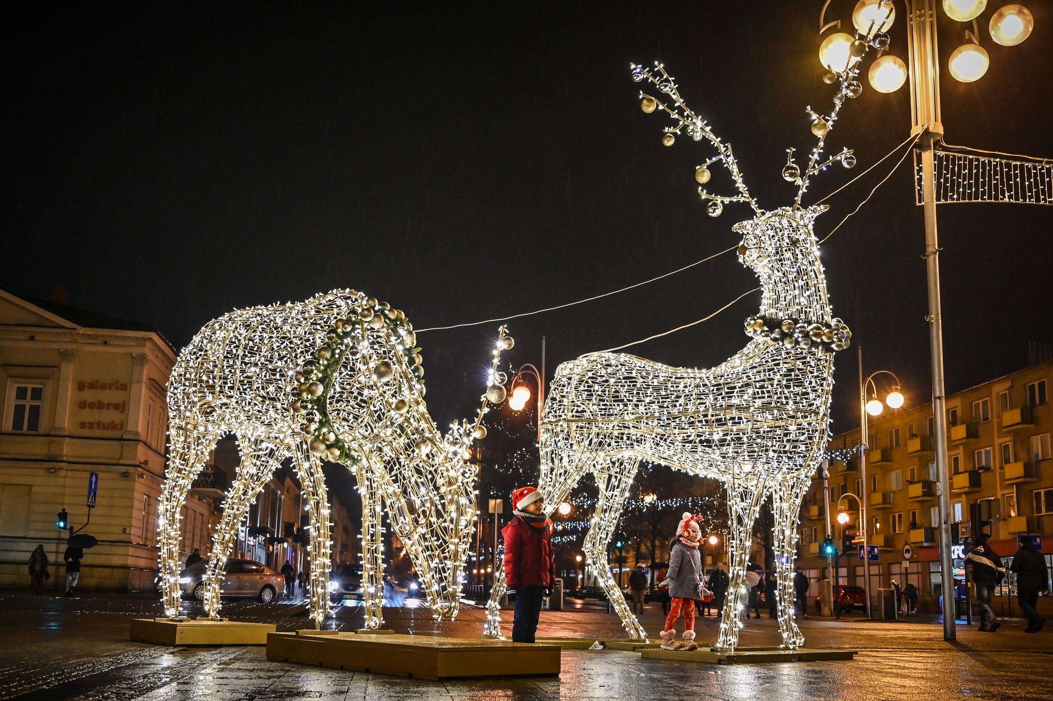 Tegoroczne ozdoby świąteczne (3D) na placu Biegańskiego to: Zimowe drzewo, Renifer, Leśna łania, Sanie z trzema biegnącymi reniferami, Huśtawka-złoty lampion oraz 4 szt. stojących dekoracji latarniowych.