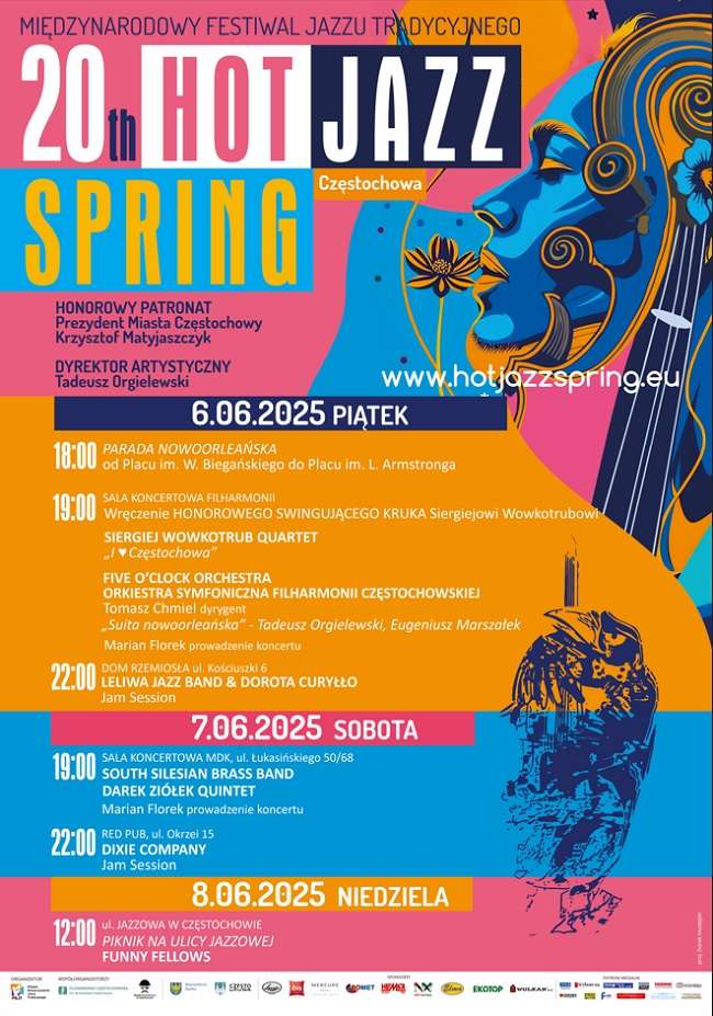 Festiwal zacznie się w piątek, 6 czerwca, o godz. 18, kiedy z placu Biegańskiego w kierunku Filharmonii wyruszy Parada Nowoorleańska. Godzinę później w sali koncertowej statuetkę ,,Honorowego Swingującego Kruka” odbierze Siergiej Wowkotrub, wirtuoz skrzypiec pochodzący z Ukrainy, mieszkający w Polsce już od ponad 30 lat. Muzyk, z powodzeniem grający tak muzykę klasyczną, jak i jazz, występował na Hot Jazz Spring wielokrotnie, w mniejszych i większych składach, także m.in. w 2018 roku ze zjawiskowym, niewidomym skrzypkiem i gitarzystą Tcha Limbergerem. W tym roku ze swoim kwartetem wykona koncert pod hasłem „I love Częstochowa”. Tego samego wieczoru z Orkiestrą Symfoniczną Filharmonii Częstochowskiej pod batutą Tomasza Chmiela wystąpi Five O’Clock Orchestra – zespół Tadeusza Orgielewskiego, spiritus movens festiwalu. Zabrzmi – już po raz kolejny w historii Hot Jazz Spring – ,,Suita Nowoorleańska”, kompozycja Tadeusza Orgielewskiego i Eugeniusza Marszałka, w której partie orkiestrowe łączą się z grą akustycznego zespołu jazzowego. Wieczór poprowadzi Marian Florek.