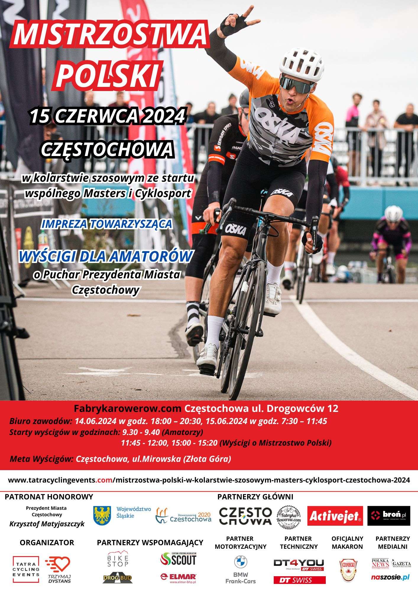 Wyścigi organizowane są w ramach Mistrzostw Polski ze wspólnego startu Masters i Cyklosport w kolarstwie szosowym. To bez wątpienia najważniejszy wyścig w sezonie dla każdego pasjonata kolarstwa – walka toczy się o tytuł Mistrza Polski. Dla uczestników, którzy nie posiadają licencji Pzkol, czeka odrębny wyścig dla amatorów. Areną zmagań będzie częstochowska Jura. Start wyścigów przy Fabryce Rowerów (ul. Drogowców) dla amatorów rozpocznie się o 9.30, a dla kolarzy, którzy biorą udział w Mistrzostwach Polski o 11.45 i 15. Wyścigi będą prowadziły przez 22-kilometrową interwałową trasę. Metą będzie wzniesienie Złota Góra.