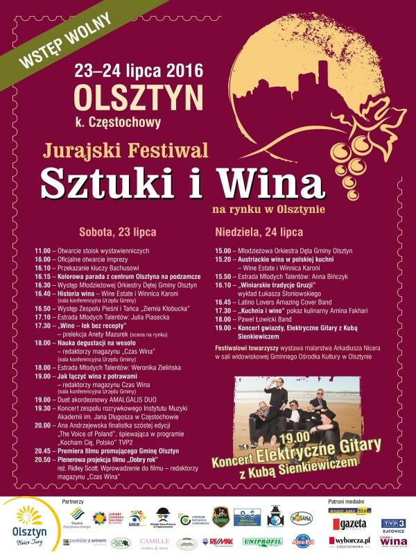 Całość uświetni między innymi: pokaz kulinarny Amina Fakhari – Kuchnia i Wino oraz nauka degustacji na wesoło. Będzie też kino pod gwiazdami z winem w roli głównej, czyli plenerowa projekcja filmu „Dobry rok”. Na scenie wystąpią: Ana Andrzejewska, Paweł Łowicki Band, Latino Lovers Amazing Cover Band, Duet akordeonowy AMALGALIS DUO, Zespół rozrywkowy AJD w Częstochowie, Młodzieżowa Orkiestra Dęta Gminy Olsztyn, Zespół Pieśni i Tańca Ziemia Kłobucka oraz solistki: Julia Piasecka, Weronika Zielińska i Anna Bińczyk.