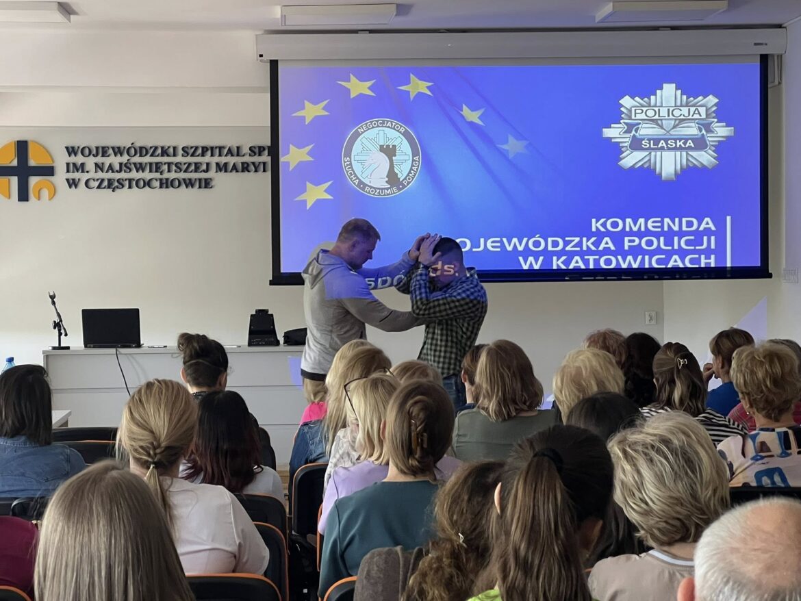 – Po ostatnich wydarzeniach, które miały miejsce w wielu placówkach medycznych w tym z tragedią, która rozegrała się w Krakowie, ale i atakiem na personel naszego szpitala w jednym z oddziałów uznaliśmy, że takie szkolenie jest niezwykle potrzebne – mówi Łukasz Majewski, rzecznik Wojewódzkiego Szpitala Specjalistycznego w Częstochowie. – Część teoretyczna prezentująca m.in. podstawy negocjacji, a przede wszystkim praktyka pokazująca jak zachować się w takiej kryzysowej sytuacji. Bardzo dziękujemy policjantom za to, że ten odzew na prośbę o przeprowadzenie takiego szkolenia był natychmiastowy.