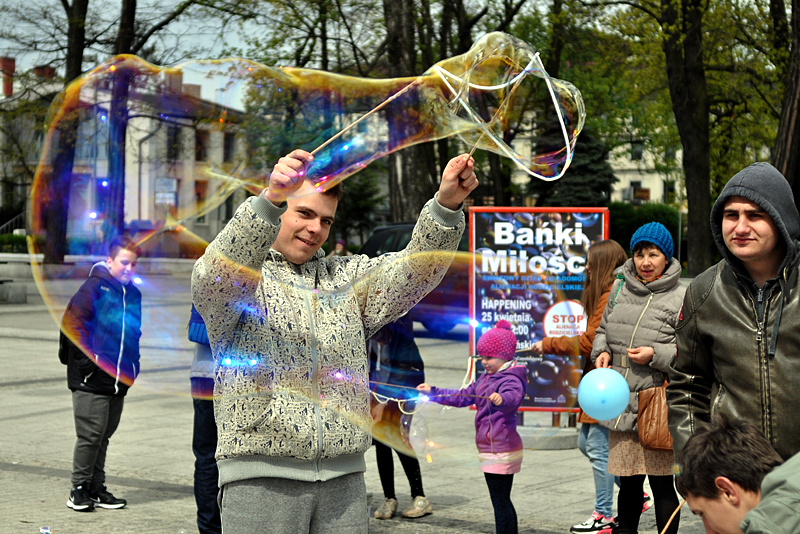 W poniedziałek w południe na placu Biegańskiego pojawiły się bańki mydlane z okazji  obchodzonego 25 kwietnia Dnia Świadomości Alienacji Rodzicielskiej.