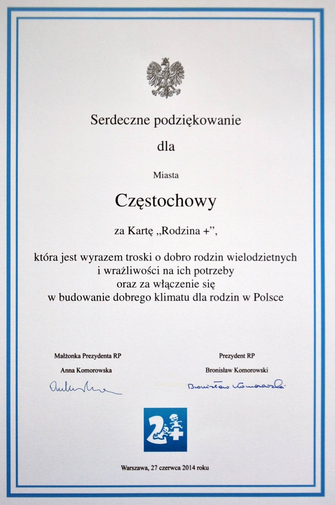 Częstochowska Karta „Rodzina +” została wprowadzona we wrześniu ubiegłego roku w ramach realizacji programu „Częstochowa dla rodziny +”. Wdrożono ją zanim wprowadzono Ogólnopolską Kartę Dużej Rodziny oraz Śląską Kartę Dużej Rodziny. Z częstochowskiego programu mogą skorzystać rodziny posiadające minimum 3 dzieci do 18. lub 26. (uczące się) roku życia. Karta pozwala na korzystanie z promocji i ulg przygotowanych przez Partnerów Projektu: kawiarnie, instytucje kultury, obiekty sportowe i rekreacyjne, kluby fitness, usługi medyczne, rehabilitacyjne i fizjoterapeutyczne, szkoły językowe, usługi fryzjerskie i kosmetyczne, taxi, ośrodki wypoczynkowe.