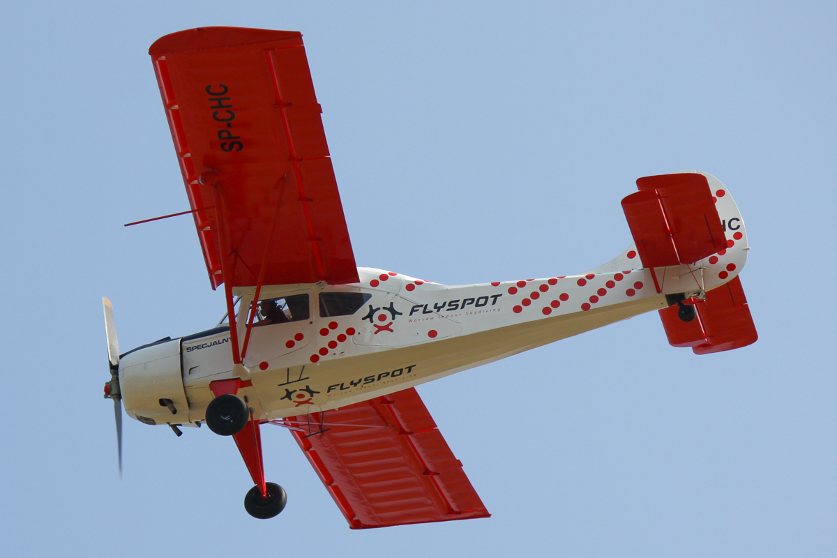 Biało-czerwone malowanie Gawrona to reklama firmy Flyspot, która jest właścicielem najnowocześniejszego w Polsce tunelu aerodynamicznego zbudowanego na granicy Warszawy i Ożarowa Mazowieckiego.
