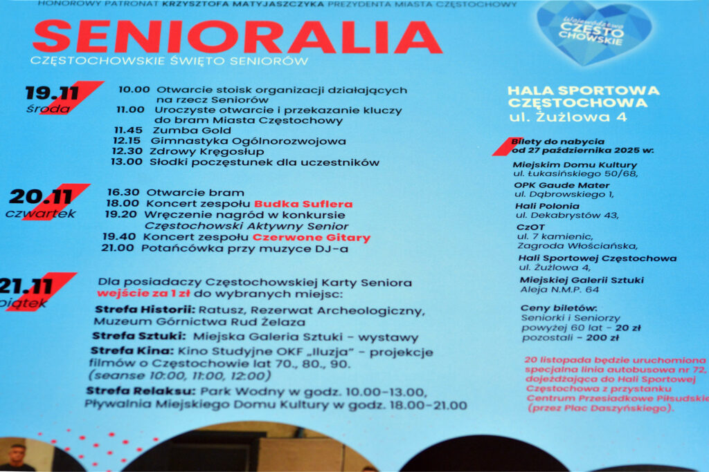 – Przyzwyczailiśmy się do tego, że Senioralia są dwudniowe, ale tym razem potrwają aż trzy dni – mówi prezydent Częstochowy Krzysztof Matyjaszczyk. – Będzie dużo tego, o czym już wiemy, a więc pierwszy dzień upłynie pod znakiem zdrowia i aktywności w Hali Sportowej Częstochowa. Tradycyjnie też nastąpi wtedy symboliczne przekazanie seniorom kluczy do bram miasta. Drugi dzień to wielka uczta muzyczna. 20 listopada Hala Sportowa Częstochowa będzie miejscem koncertów Budki Suflera i Czerwonych Gitar, a na koniec potańcówka z didżejem, to co, seniorzy też bardzo lubią. Rozstrzygnięty zostanie konkurs „Częstochowski Aktywny Senior”. Nowością będzie dzień trzeci dedykowany posiadaczom Karty „Częstochowski Senior”. 21 listopada będą mogli za symboliczną złotówkę odwiedzić różne miejsca w mieście – wybrać się do Strefy Historii, Sztuki, Kina i Relaksu.
