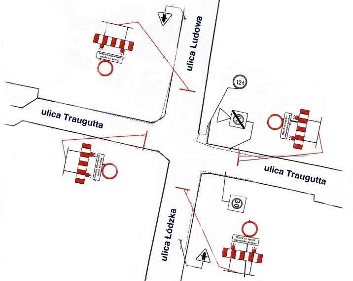 W związku z tym wprowadzona zostanie tymczasowa organizacja ruchu polegająca na zamknięciu skrzyżowania ul. Traugutta z ul. Łódzką we wszystkich kierunkach. Niemożliwy będzie przejazd ul. Łódzką przez skrzyżowanie z Traugutta, jak i przejazd ul. Traugutta przez skrzyżowanie z Łódzką. Kierowcy muszą ominąć zamknięcie alternatywnymi połączeniami w obrębie tego miejsca. Przepraszamy za utrudnienia. Szczegóły zamknięcia i wspomnianej organizacji ruchu w schemacie z załącznika.