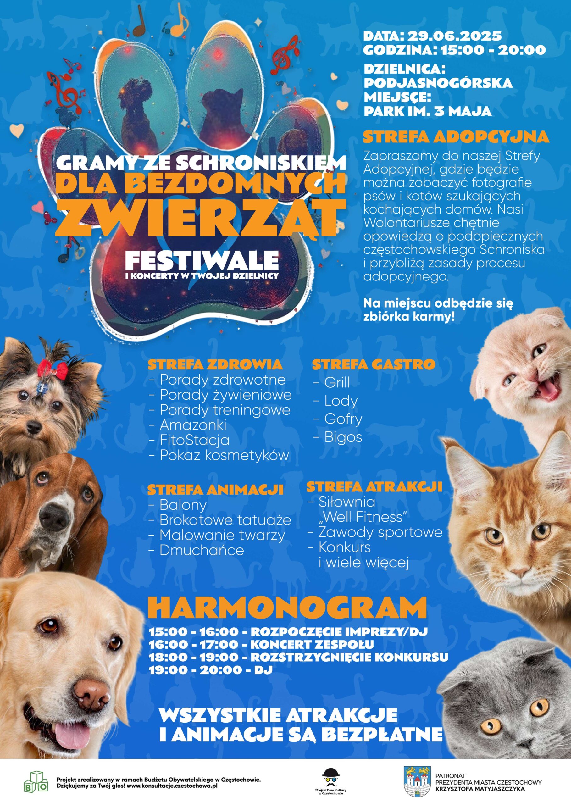 W najbliższą niedzielę, 29 czerwca odbędzie się impreza, która łączy muzykę, pomoc i dobrą zabawę - "Festiwale i Koncerty na Podjasnogórskiej! Gramy razem ze Schroniskiem dla Bezdomnych Zwierząt!”.