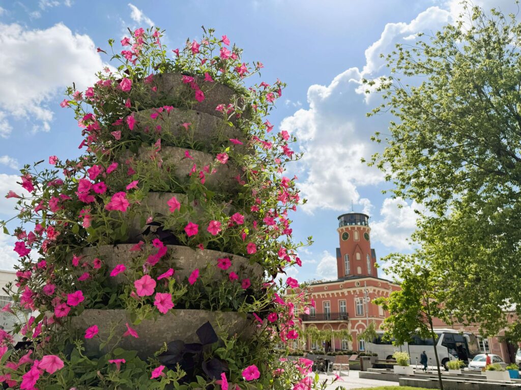 W 2 wieżach o wys. 75 cm przy Urzędzie Miasta oraz 5 takich wieżach na pl. Daszyńskiego posadzono ciemnoróżową supertunię, żółtą ipomeę i ciemnoróżową werbenę – razem 420 sztuk tych roślin.