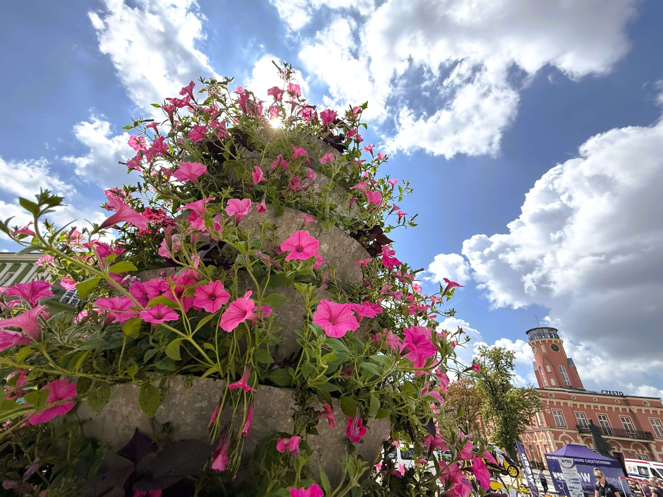 W 6 wieżach kwiatowych o wys. 240 cm na pl. Biegańskiego posadzono łącznie 1350 sztuk trzech gatunków – różowej supertunii, bordowej ipomei oraz różowej werbeny.