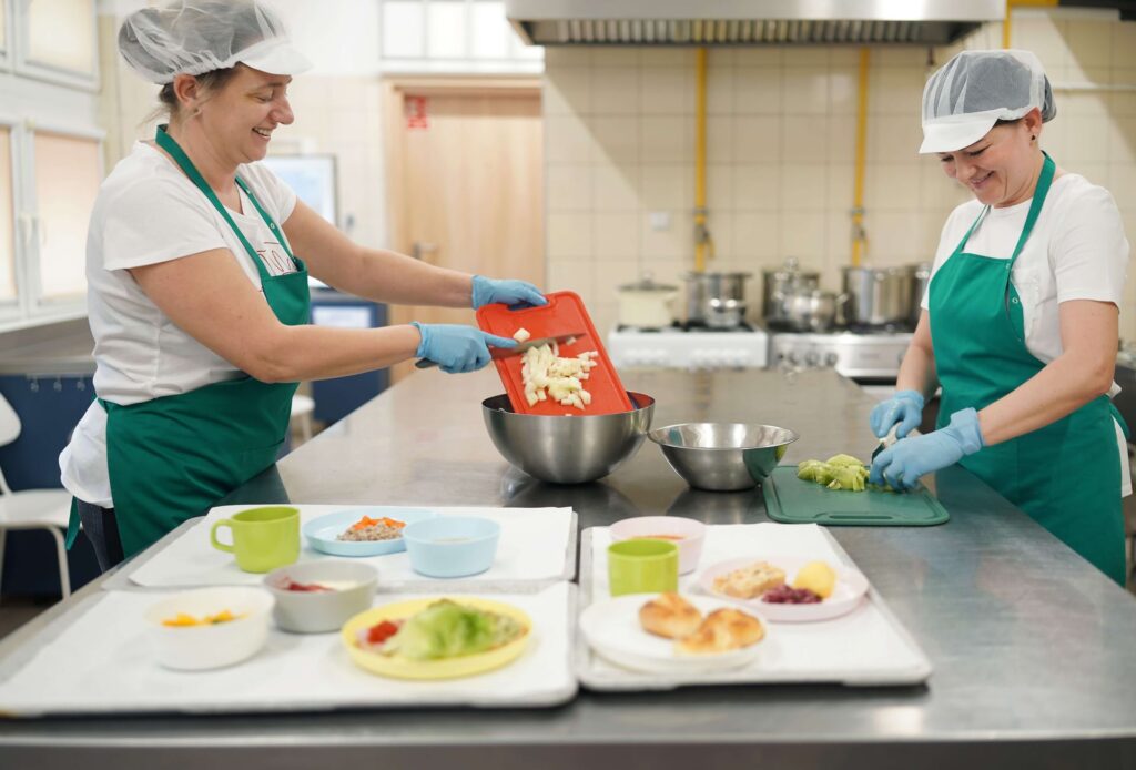 Żłobek posiada własne zaplecze kuchenne, w którym codziennie przygotowywane są urozmaicone, zgodne z normami żywieniowymi posiłki, związane z porą roku, uwzględniające nietolerancje i alergie pokarmowe.